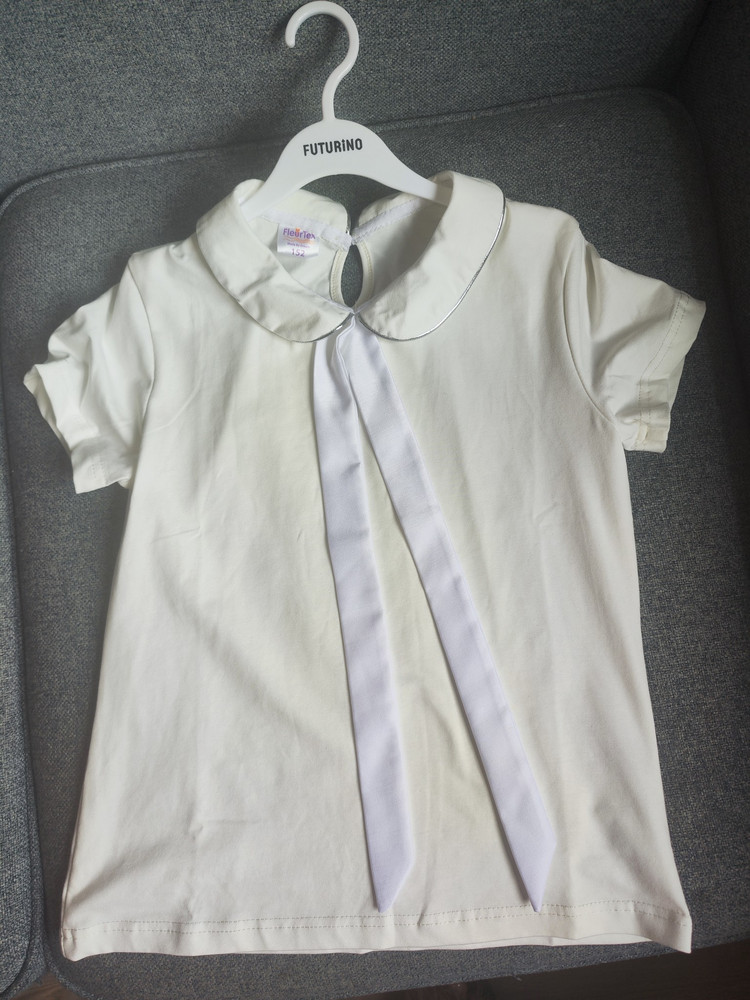 Приталенный силуэт подчёркивает фигуру и выглядит опрятно в составе школьной формы. Короткий рукав обеспечивает комфорт в помещении и в тёплое время года. Модель легко комбинируется с классическими юбками, сарафанами, брюками и жилетами, а также может стать основой праздничного наряда.