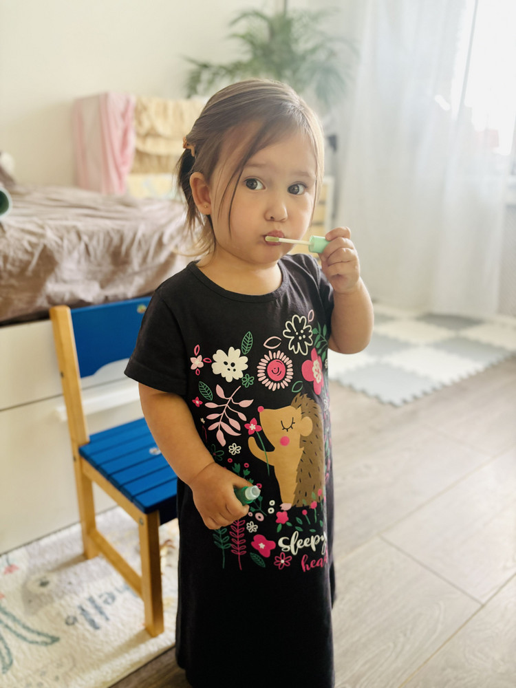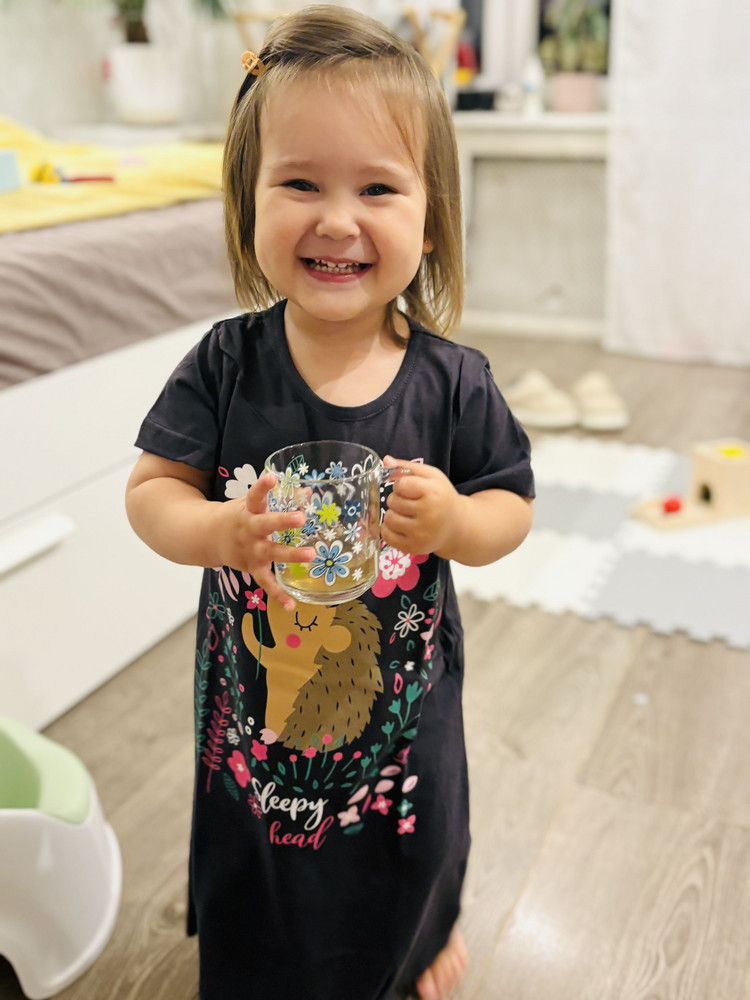 Спать, конечно, в ней не удобно, в том плане, что дочка раскрывается от одеяла и ноги раскидывает - и получается, что ночнушка задирается, как не поправляй, и детка как будто бы спит в обычной короткой футболке. Так что для нас на сон пока только пижамки подходят)